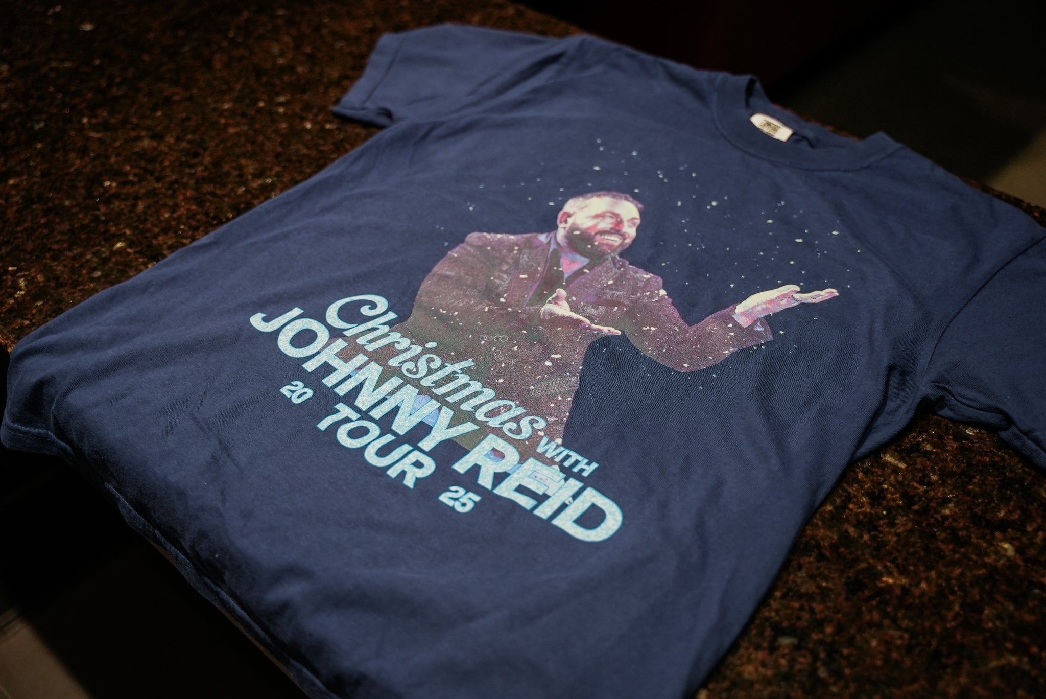 Features Johnny Reid photo and "Christmas with Johnny Reid" on front, 2025 tour cities on the back of a navy blue unisex crew neck t-shirt.